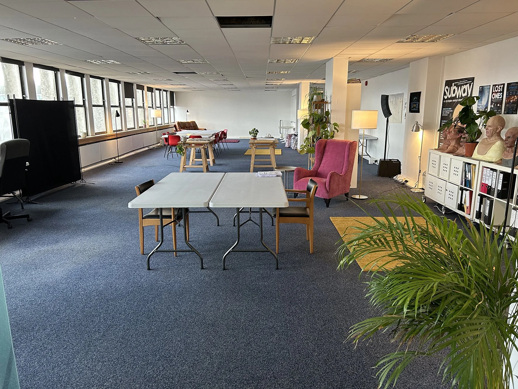 We have a bright and spacious work and rehearsal space which can be used for meetings, workshops, readings, writing and rehearsals.